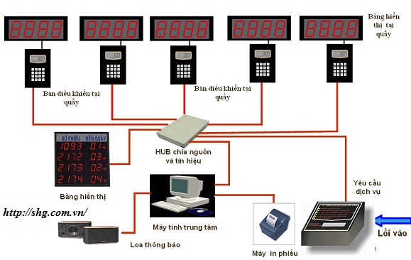 Một bộ xếp hàng điện tử đầy đủ bao gồm các thiết bị sau: